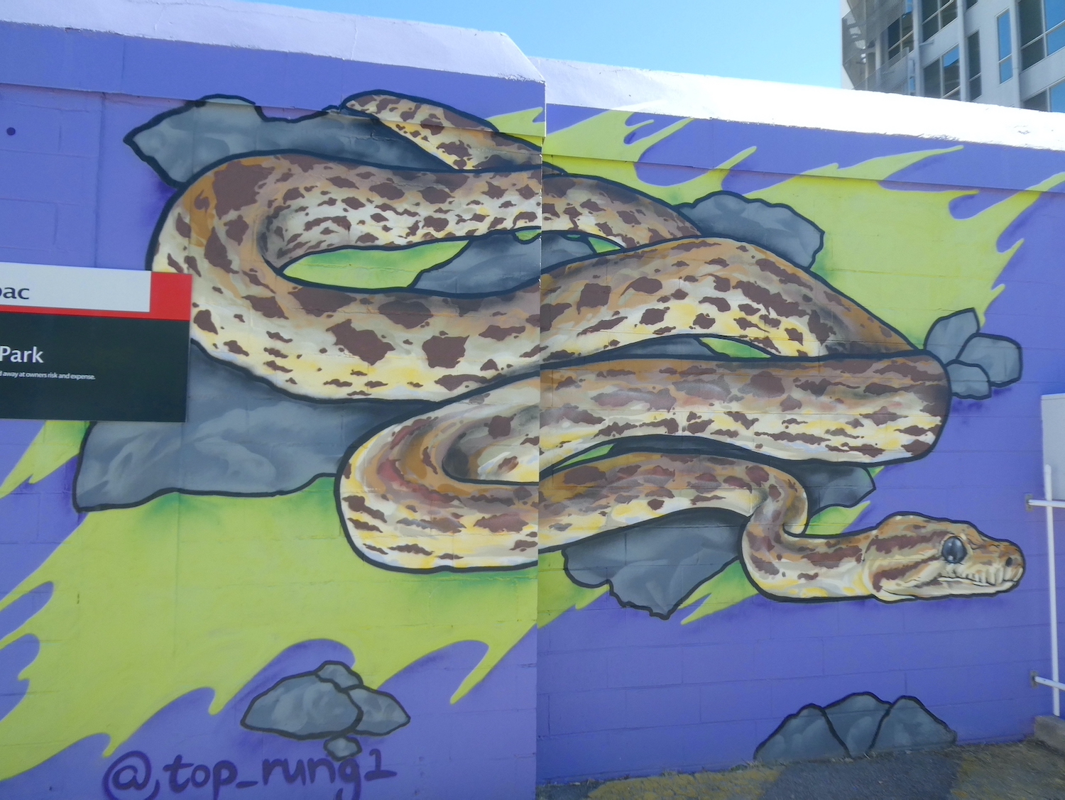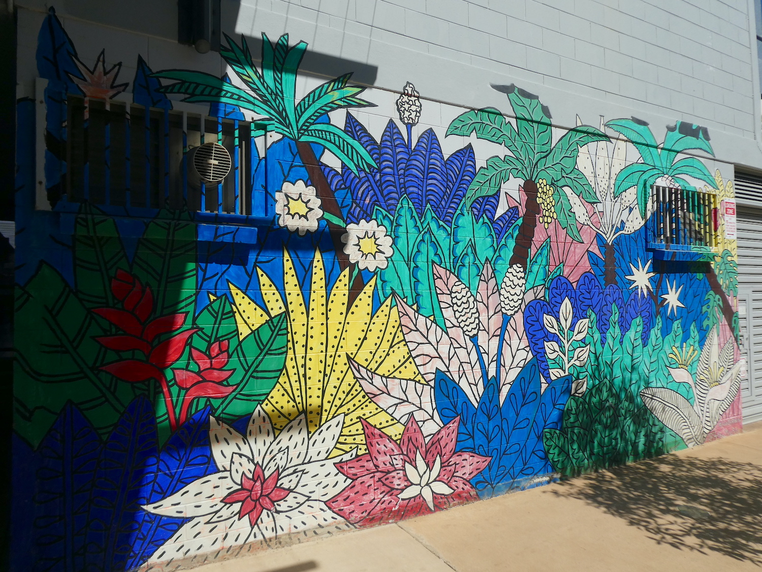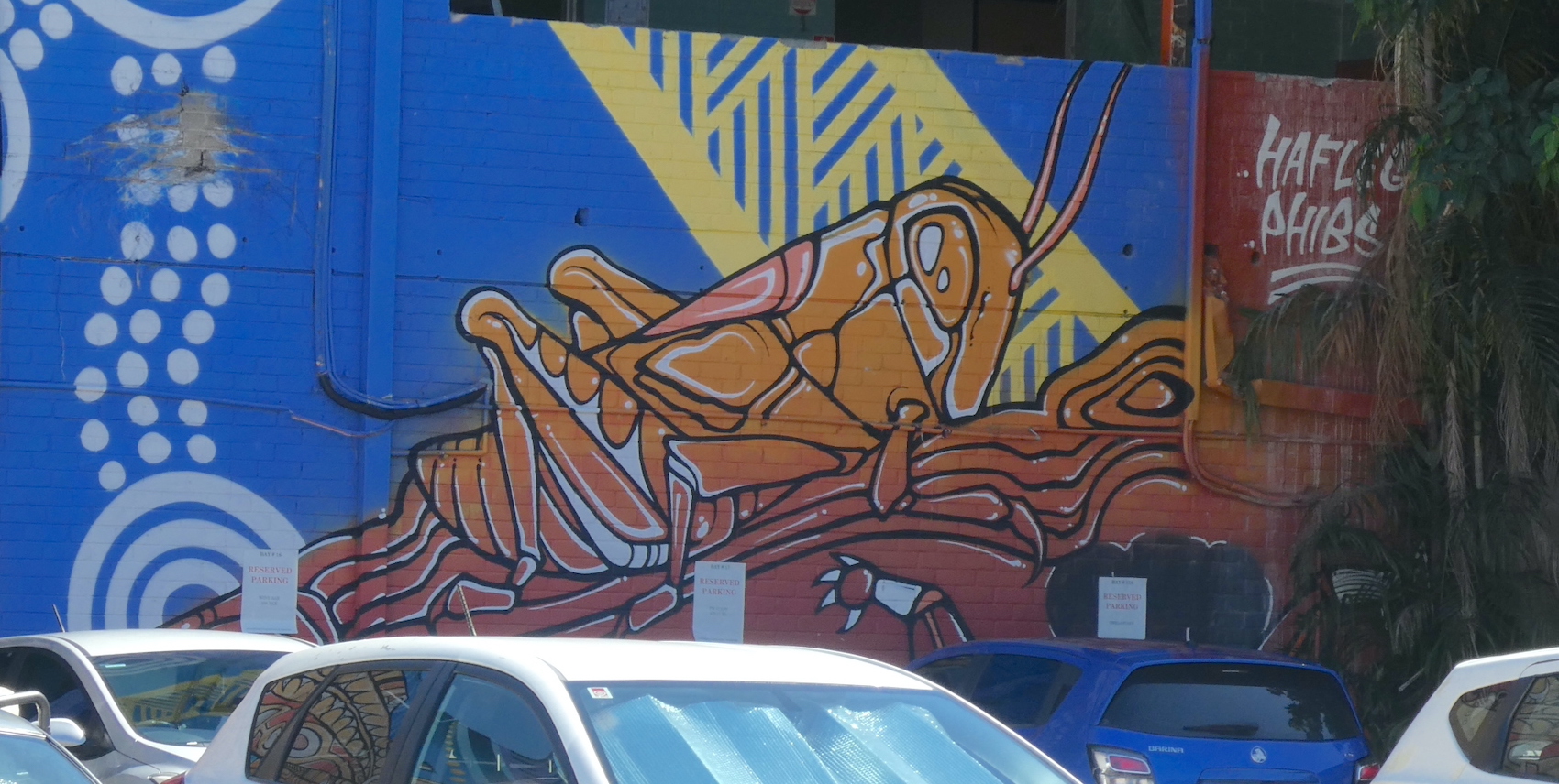 Having run out of time on our first reconnaissance, we returned a few days later to continue our discovery of the artistic embellishments adorning the lanes of Darwin. As well as the annual Darwin Street Art Festival, the ‘Art to Street’ project in July 2019 invited local and emerging artists to create murals on seven public spaces across Darwin. Two of these colour the walls of West Lane Car Park.
